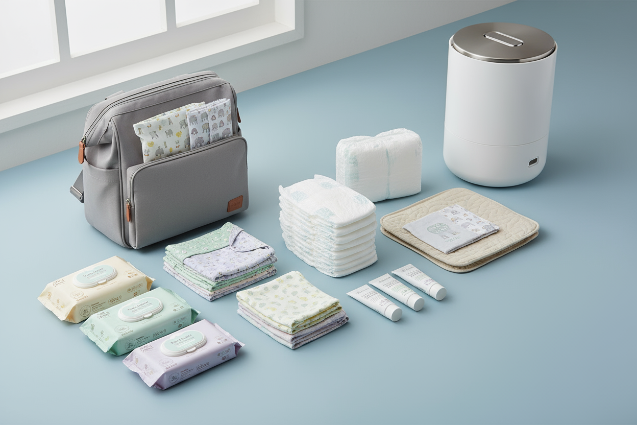 Diapers (disposable and cloth), wipes, diaper bags, changing mats, and creams.
