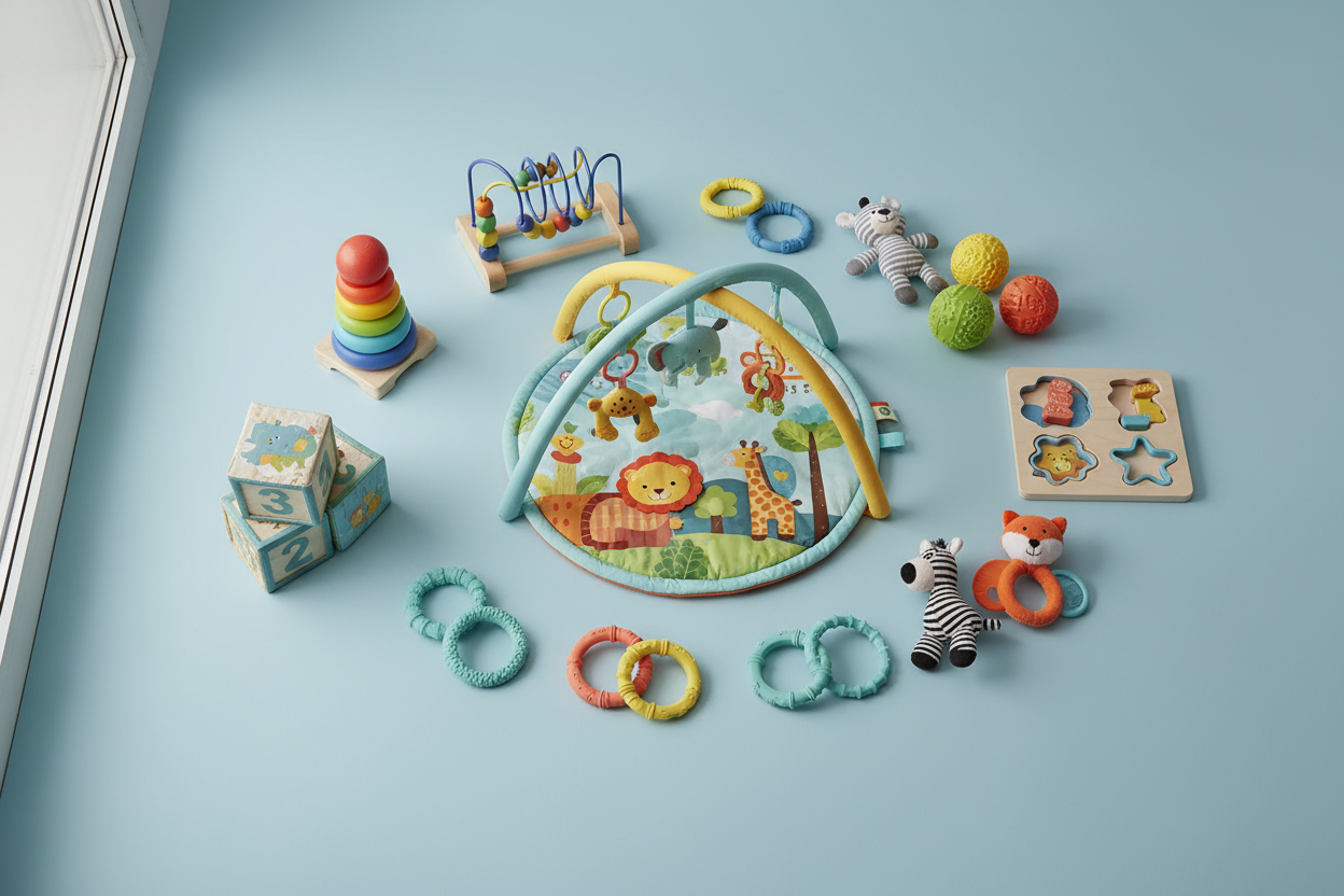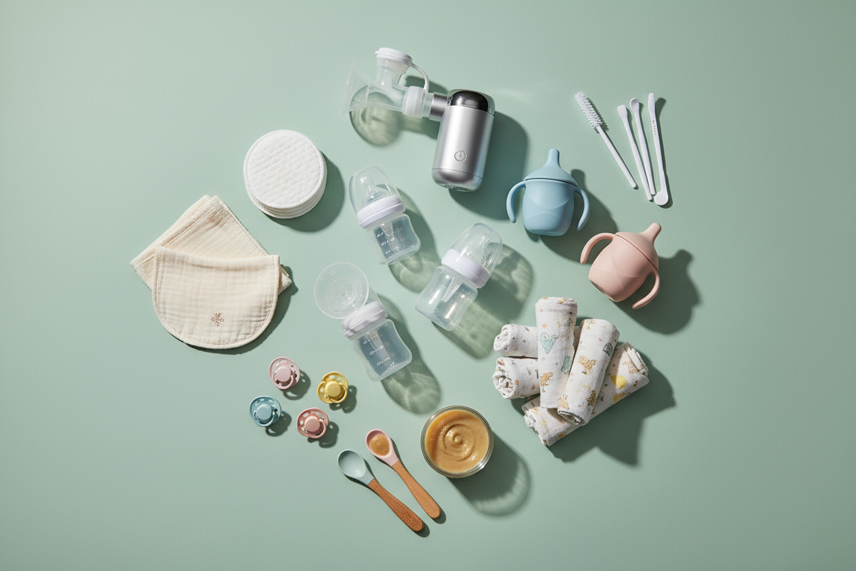 Bottles, bibs, burp cloths, formula, nursing bras, and accessories.