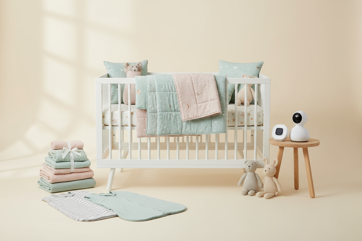Cribs, mattresses, bedding, swaddles, sleep sacks, and baby monitors.
