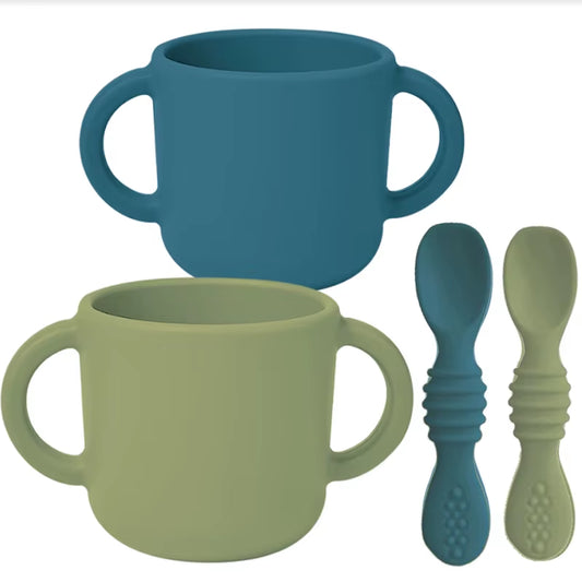 Silicone Baby Cup Spoon Set Portable Water Bottle with Double Handle Leakproof Baby Cups Feeding Liquid Baby Item Baby Tableware